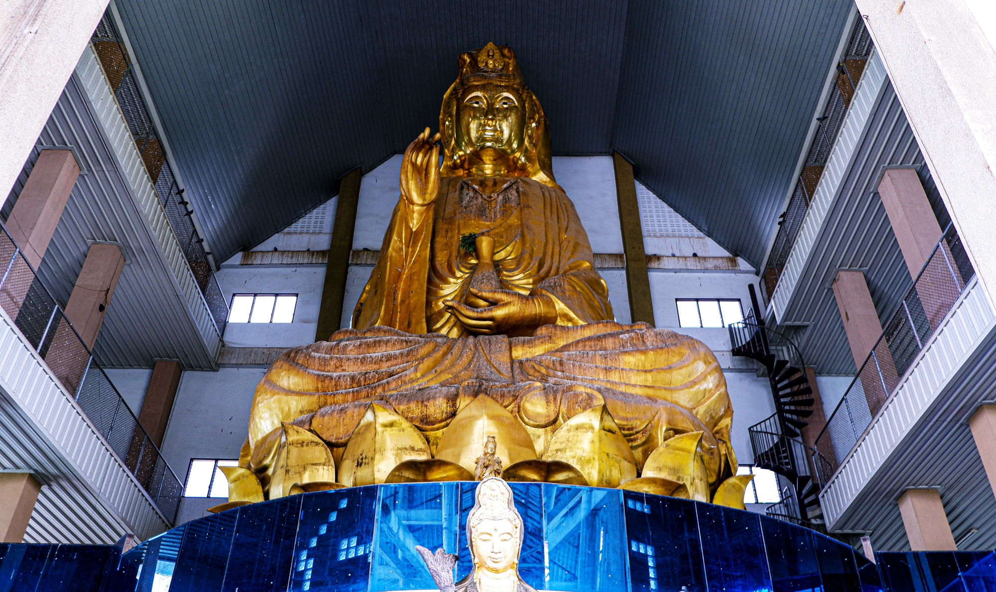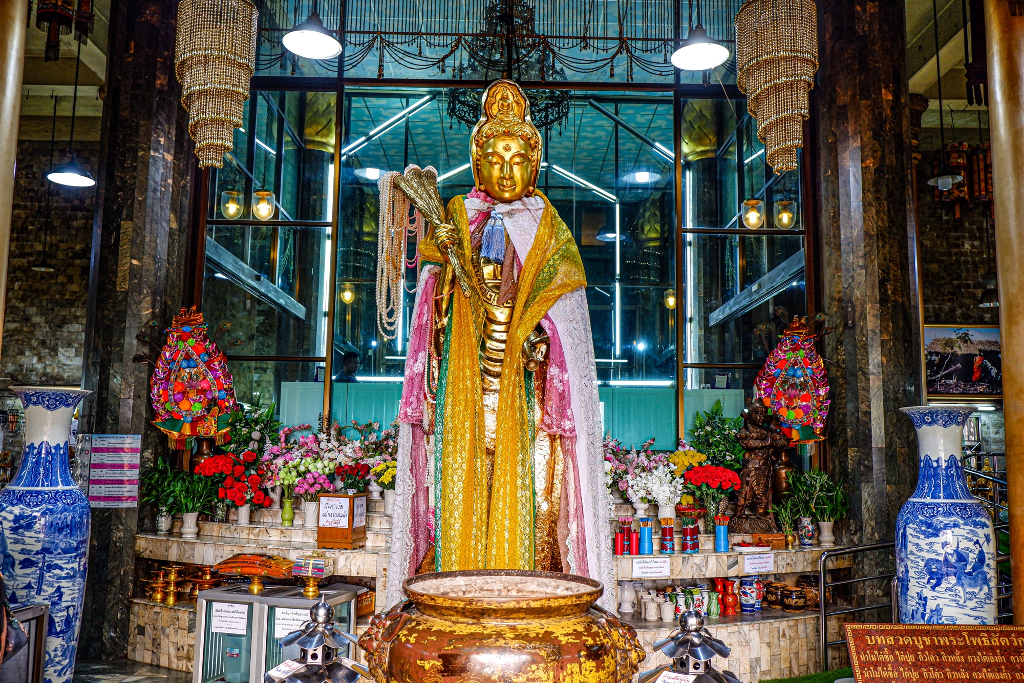 พระโพธิสัตว์กวนอิม ปางนั่งประทานพร สร้างขึ้นโดย พระราชวัลภาจารย์ (ดาวเรือง อาจารคุโณ) ร่วมกับญาติโยม เมื่อปี พ.ศ.2539 แล้วเสร็จ พ.ศ.2542 หล่อด้วยทองเหลืองเป็นชิ้นมาประกอบขึ้นเป็นรูป สูง 16 เมตร หน้าตักกว้าง 9 เมตร น้ำหนัก 50 ตัน